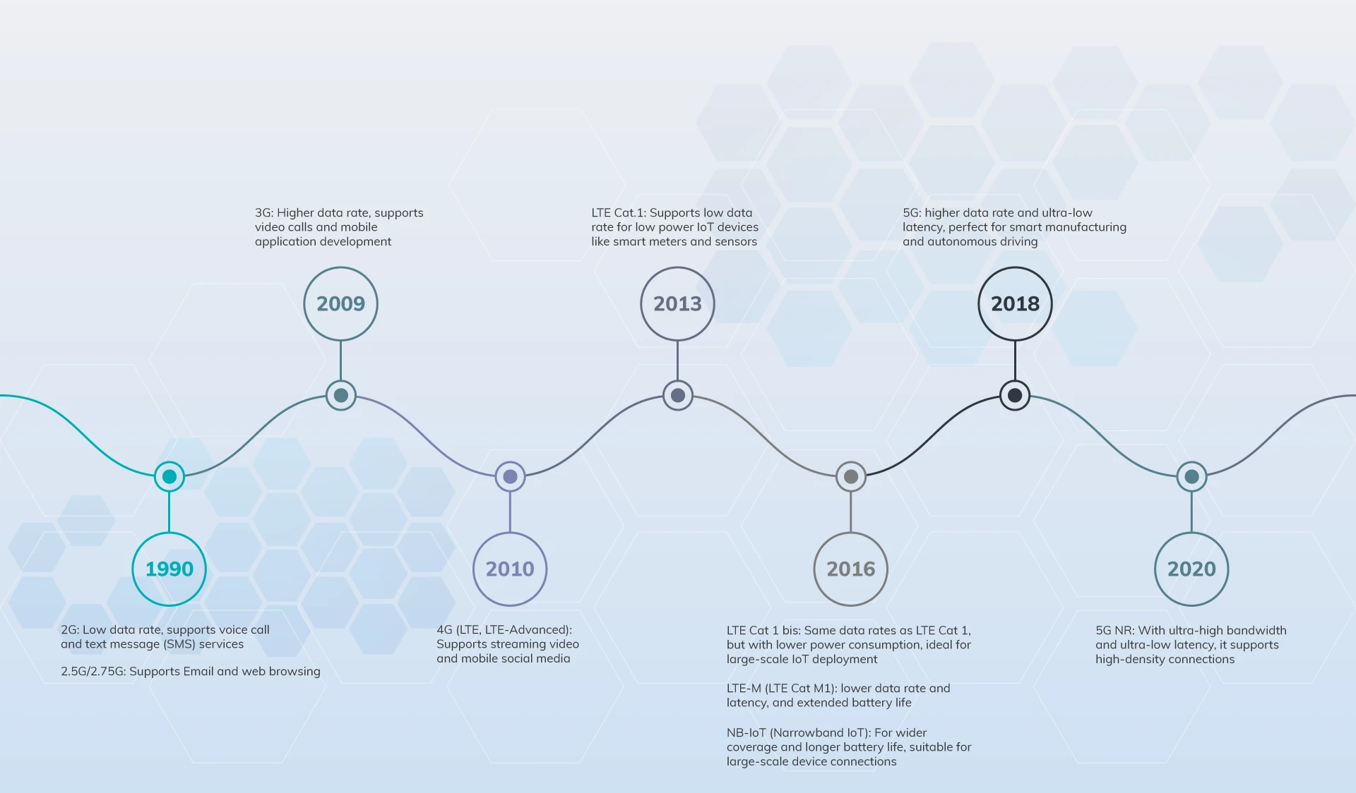 | Use Cases | Smart cities, Industrial IoT | Wearables, asset tracking | Smart metering, environmental monitoring | Large-scale networks, autonomous driving, AR/VR |