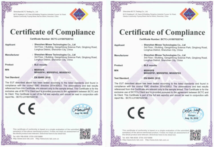 We are glad to say that Minew MS50SFAlB BLE module have passed the Cedificate of Compliance (CE, EN50498 2010), which means that they’ve got the permission in the application of automotive electrical area standard since duly 1 2011 which stipulates the form of CE certification for some in-vehicle electronic products. The scope of application is the product defined in Clause 3.2 g of Appendix I of the 2004/104/EC Automotive EMC Directive.