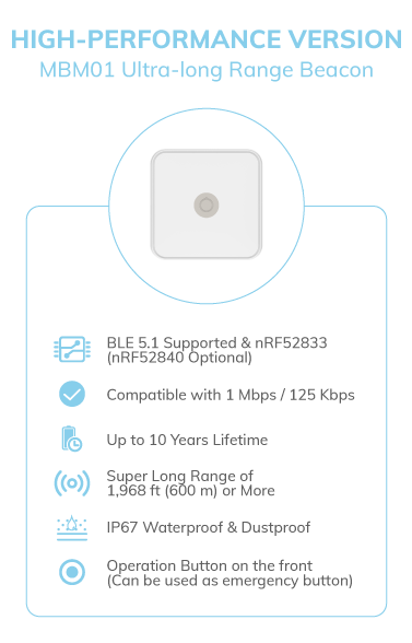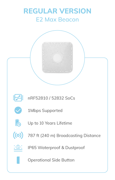 E2 Max Beacon is a max beacon with up to 240m broadcasting range and Bluetooth LE 5.0 tech & 10 years of battery service; it is widely used in public areas including airports, train stations, and museums for indoor positioning or commercial advertising.If you’re looking for a beacon with long-range and large battery capacity features, the latest MBM01 Ultra-Long Range Beacon is an alternative design that has a transmission range of 1,968 ft (600 m) or more (in open areas) and a service life of up to 10 years with the powerful Nordic nRF52833 series based.