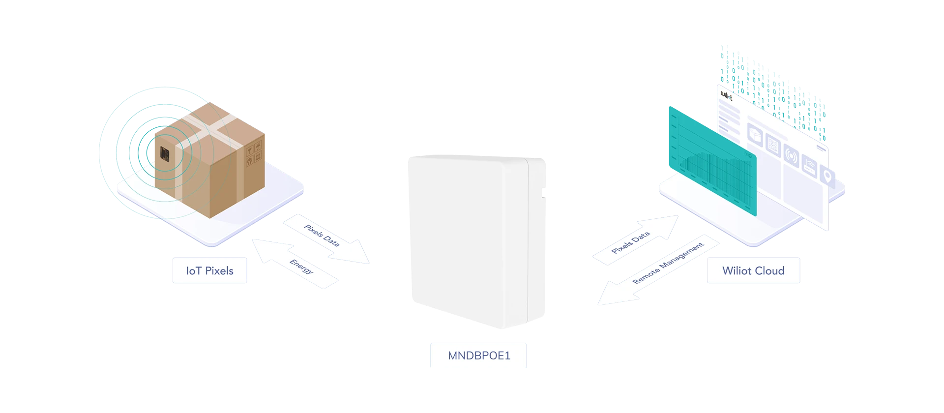 The MNDBPOE1 Gateway & PowerBridge Combo is the critical link between Wiliot IoT Pixels and the Wiliot Cloud, enabling seamless data flow and powering the Ambient IoT.